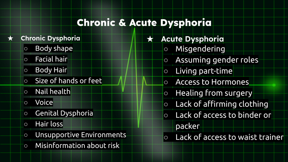 Gender dysphoria is when someone has an emotional or physical feeling that feels misaligned with their gender identity.
